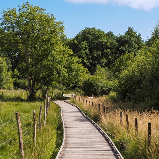 Prairies humides offrant une biodiversité remarquable. Sentier comportant deux boucles en compagnie d’Iris la lutine : une de 750 m accessible aux personnes à mobilité réduite et une d’1 km. Aucune difficulté.