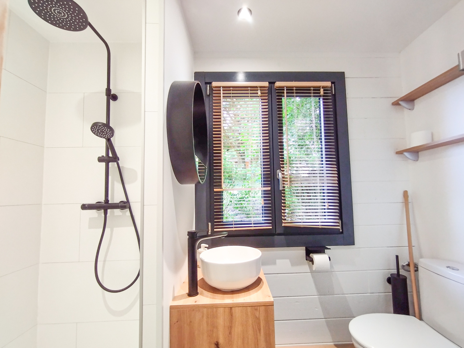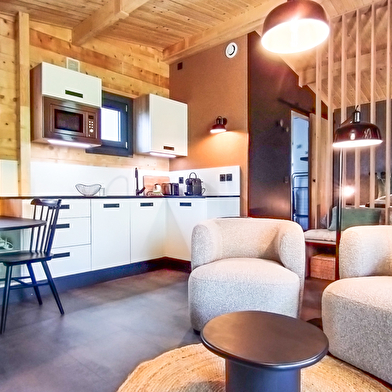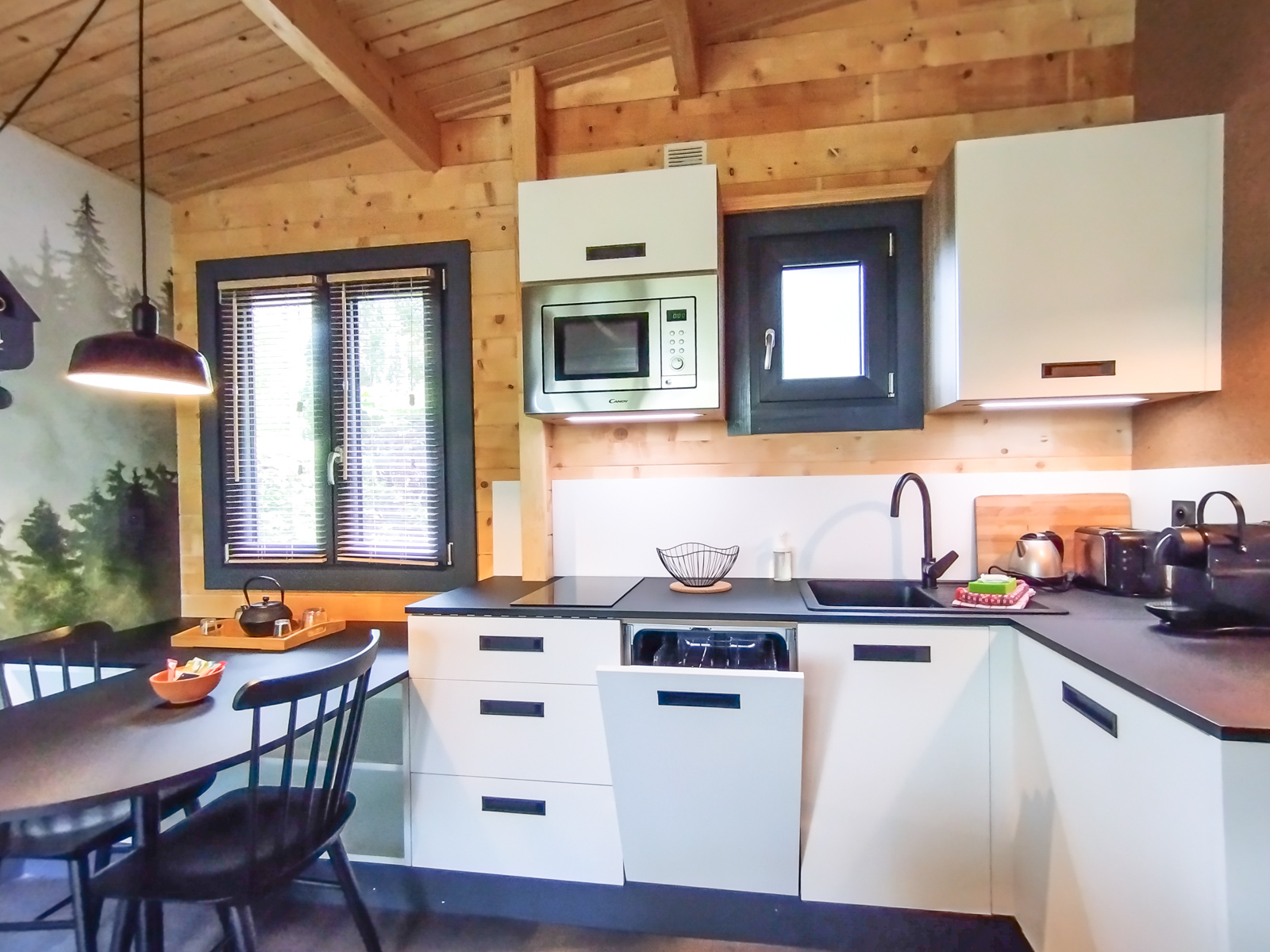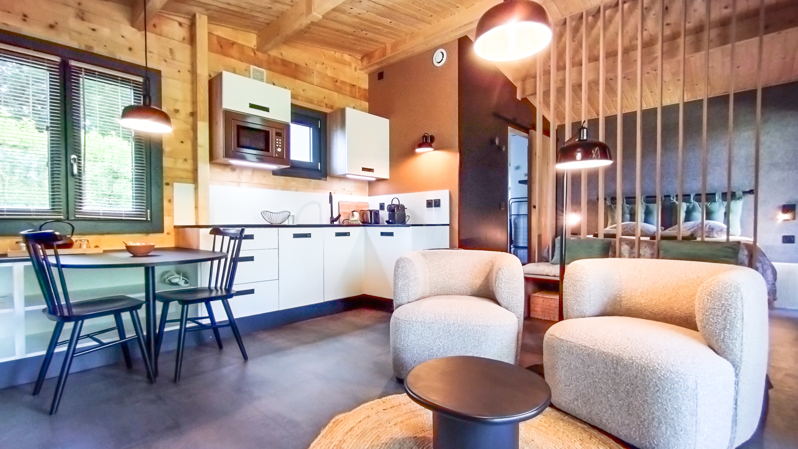 The chalet is a single room (sleeps 2) with a large fully-equipped living room, beautiful kitchen (with dishwasher) and dining area. Bedroom block with 1 double bed (160 cm). Beautiful bathroom with large shower. Furnished terrace and private garden.