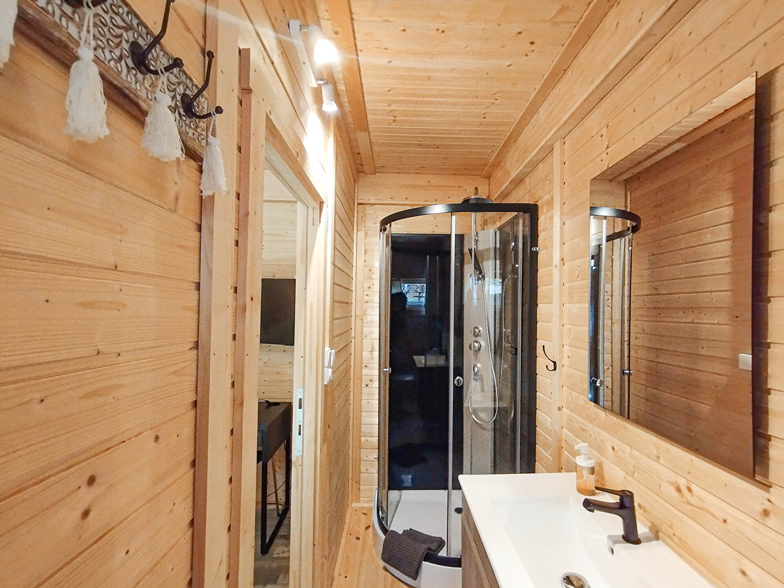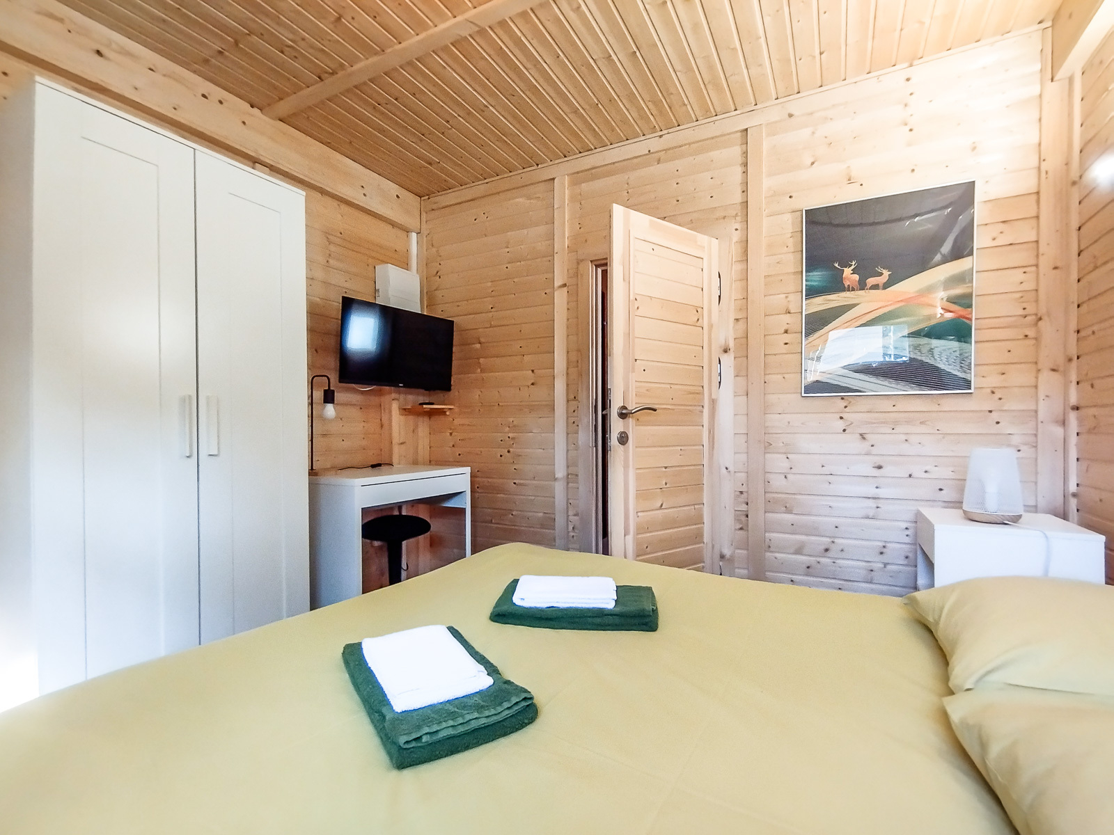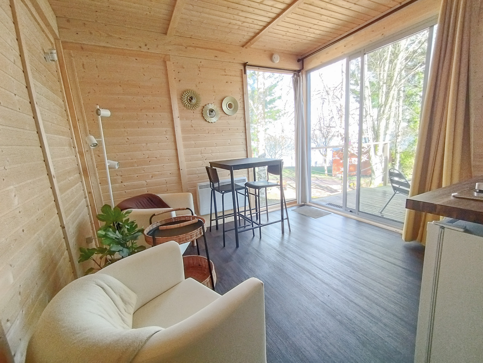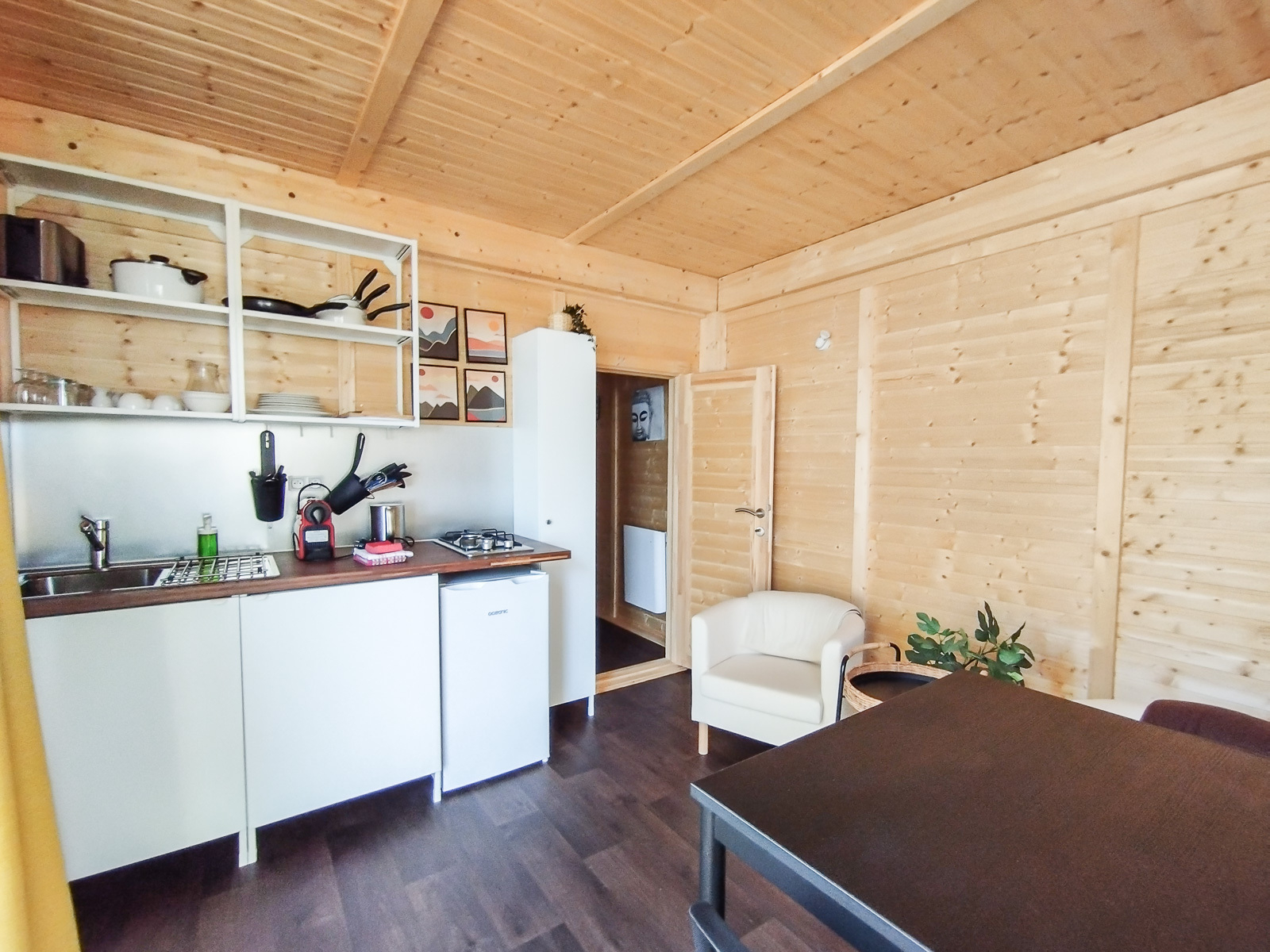Modern, gezellig chalet uitsluitend voor een verblijf alleen of met z'n tweeën. Plat dak en volledig van hout. Mooie badkamer en romantische slaapkamer. Kantoor voor telewerken. Met een klein terras met uitzicht op het meer voor een aperitief en een tuin voor een siësta onder de luifel. Schaduwrijk in de zomer. Meer oosterse "zonsopgang" decoratie. Linnen en schoonmaak inbegrepen.