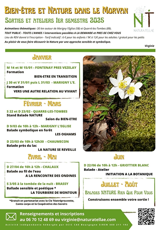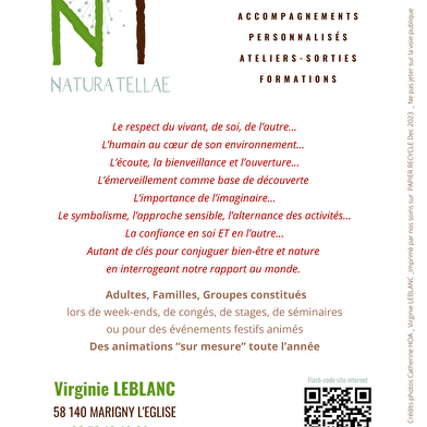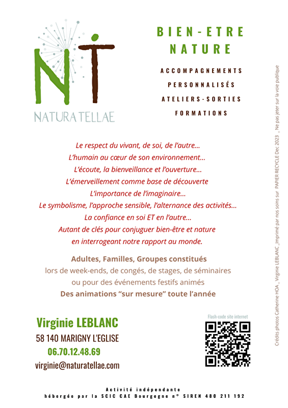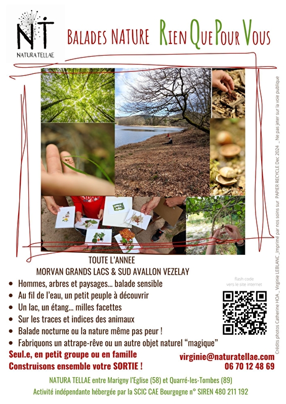 Ik leid wandelingen en workshops die uitnodigen tot een frisse kijk op de bossen, meren en landschappen van de Morvan. Met een symbolische benadering van planten en dieren, die natuurwetenschappelijke informatie combineert met een gevoelige ontdekking van de omgeving, kan ik formats creëren voor elk publiek: alleen, met familie en vrienden of als onderdeel van een seminar.