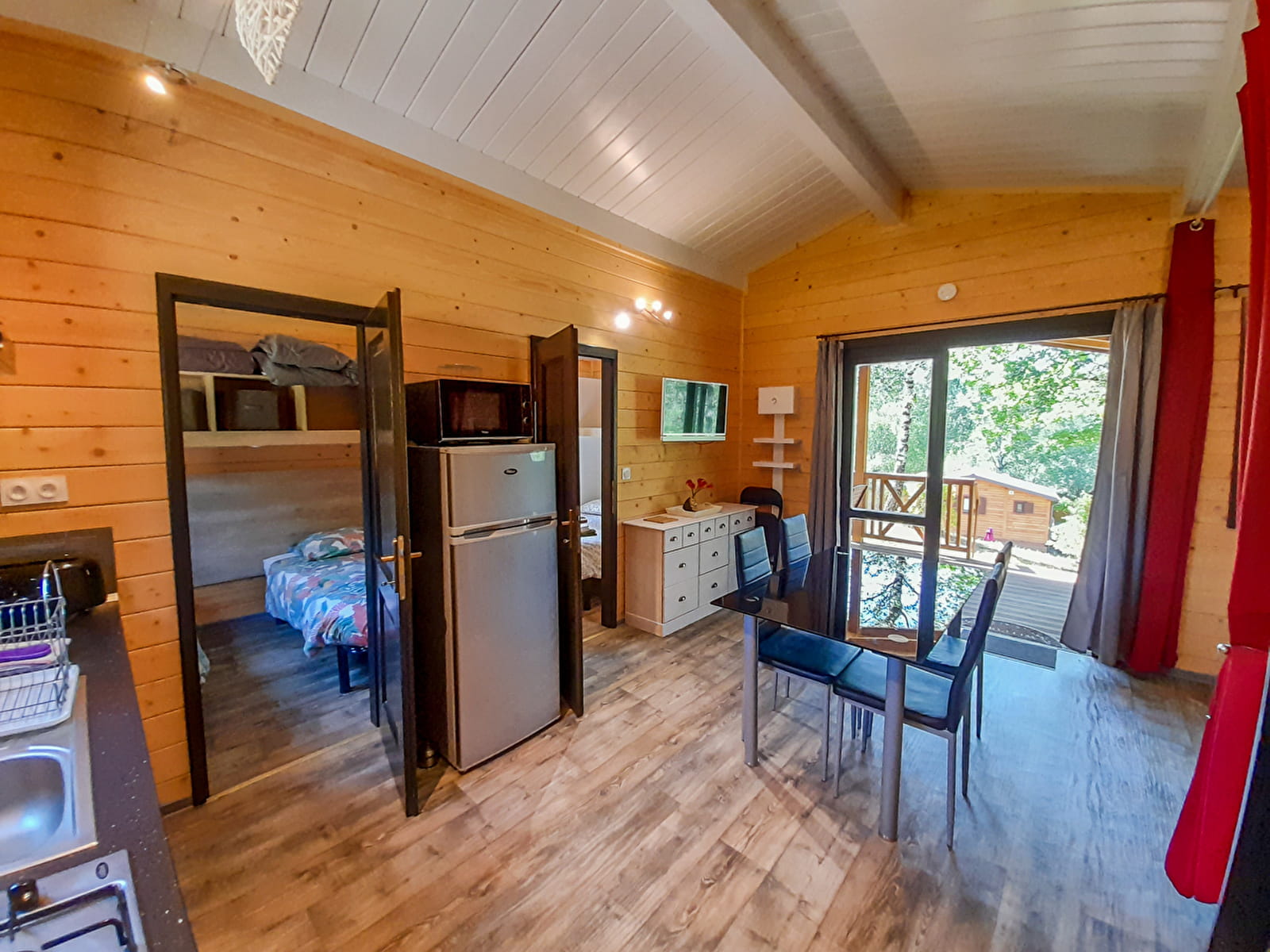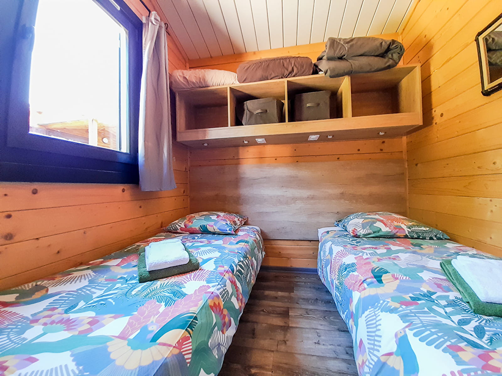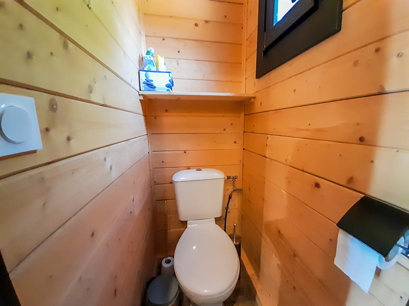 Depuis la terrasse en bois, s'ouvre le grand séjour avec sa superbe cuisine laquée en rouge. Avec ses deux chambres (1 lit double et 2 lits simples) et son salon en alcôve, la résidence accueille jusqu'à 6 personnes. Une magnifique salle de bain toute en bois avec belle douche et WC séparé.