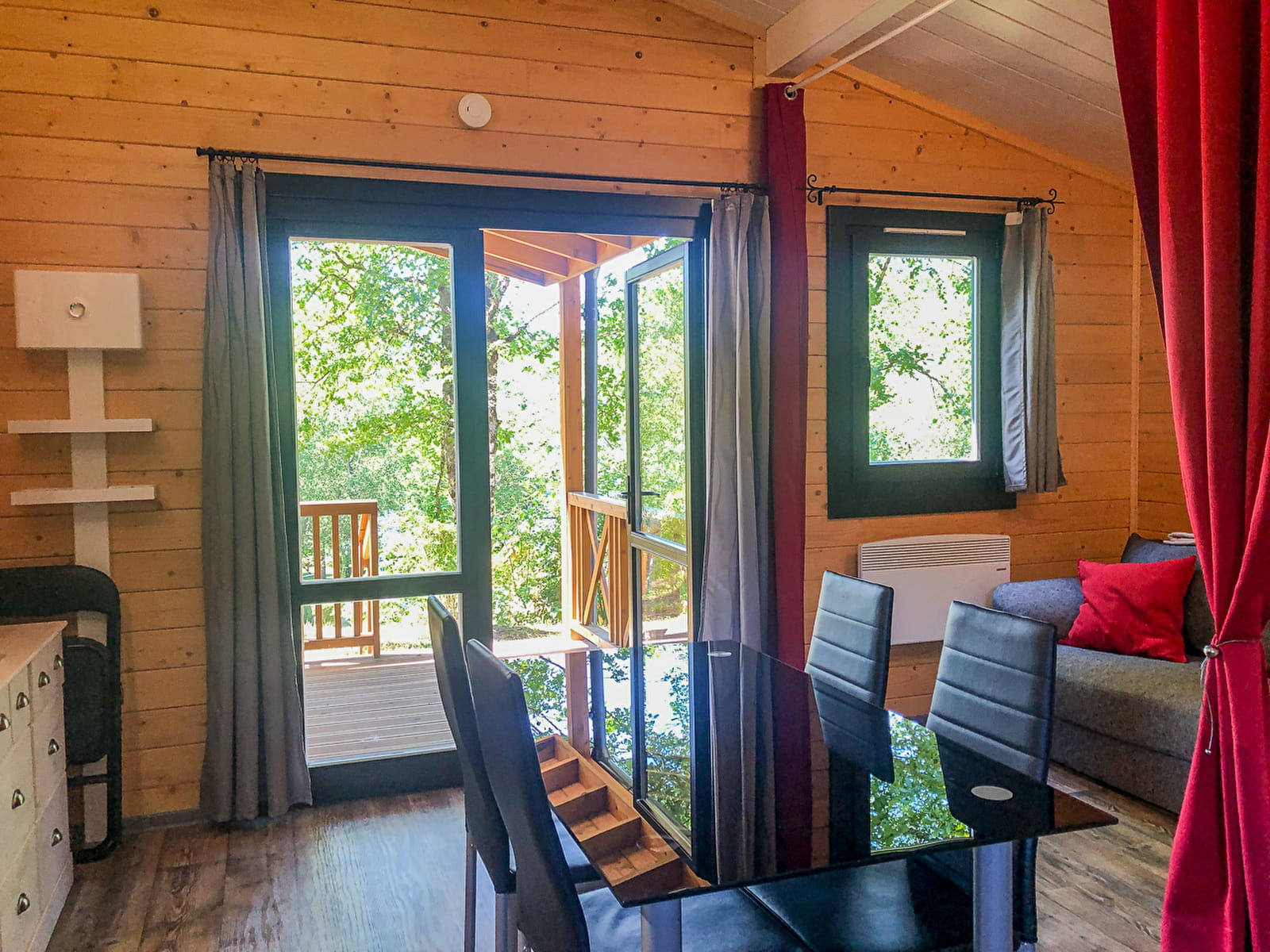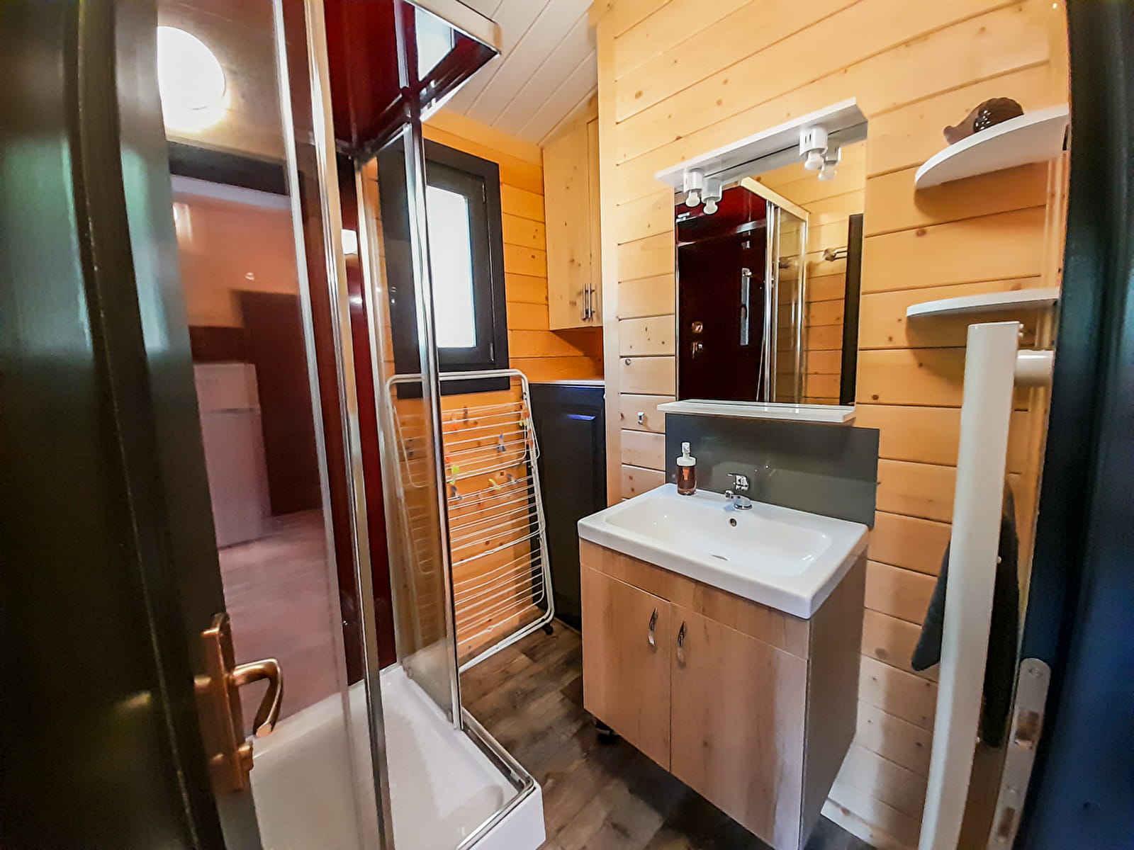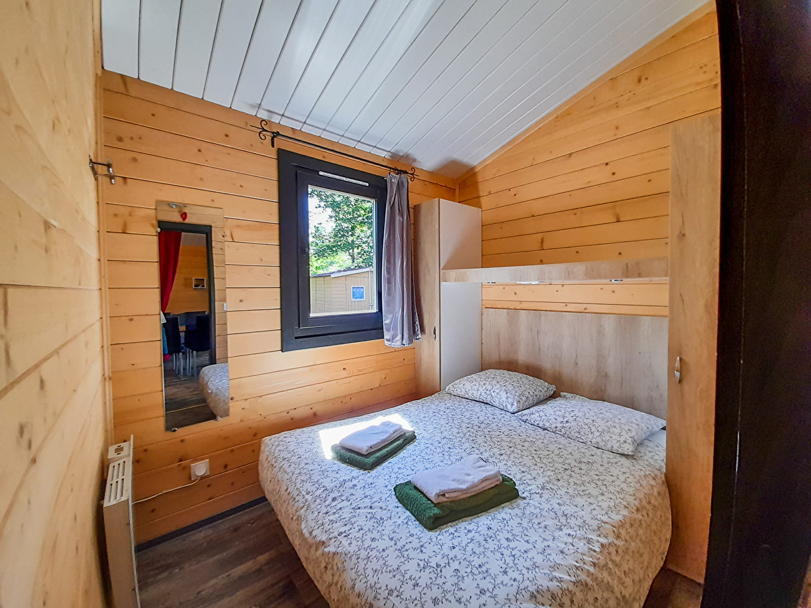 Depuis la terrasse en bois, s'ouvre le grand séjour avec sa superbe cuisine laquée en rouge. Avec ses deux chambres (1 lit double et 2 lits simples) et son salon en alcôve, la résidence accueille jusqu'à 6 personnes. Une magnifique salle de bain toute en bois avec belle douche et WC séparé.