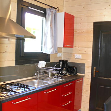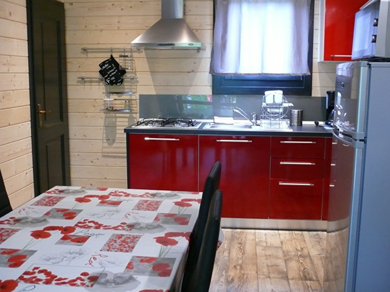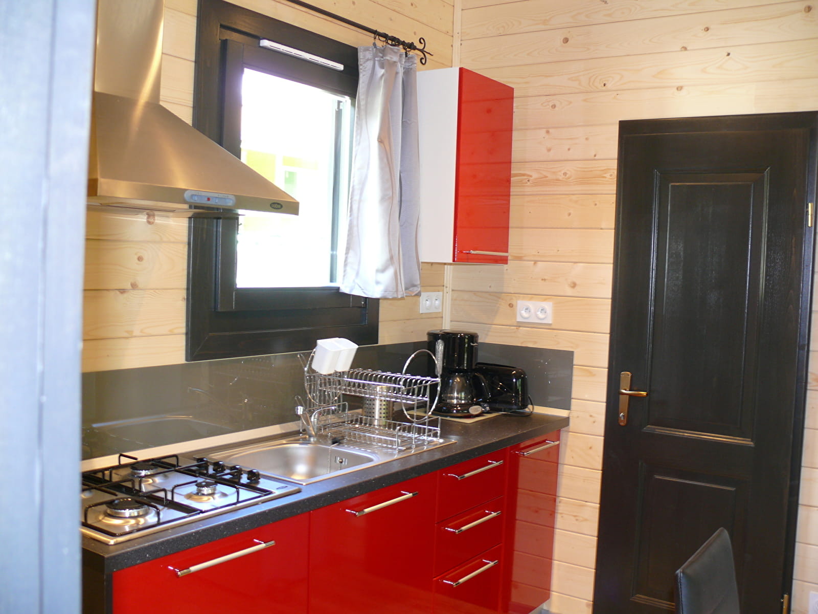 Depuis la terrasse en bois, s'ouvre le grand séjour avec sa superbe cuisine laquée en rouge. Avec ses deux chambres (1 lit double et 2 lits simples) et son salon en alcôve, la résidence accueille jusqu'à 6 personnes. Une magnifique salle de bain toute en bois avec belle douche et WC séparé.