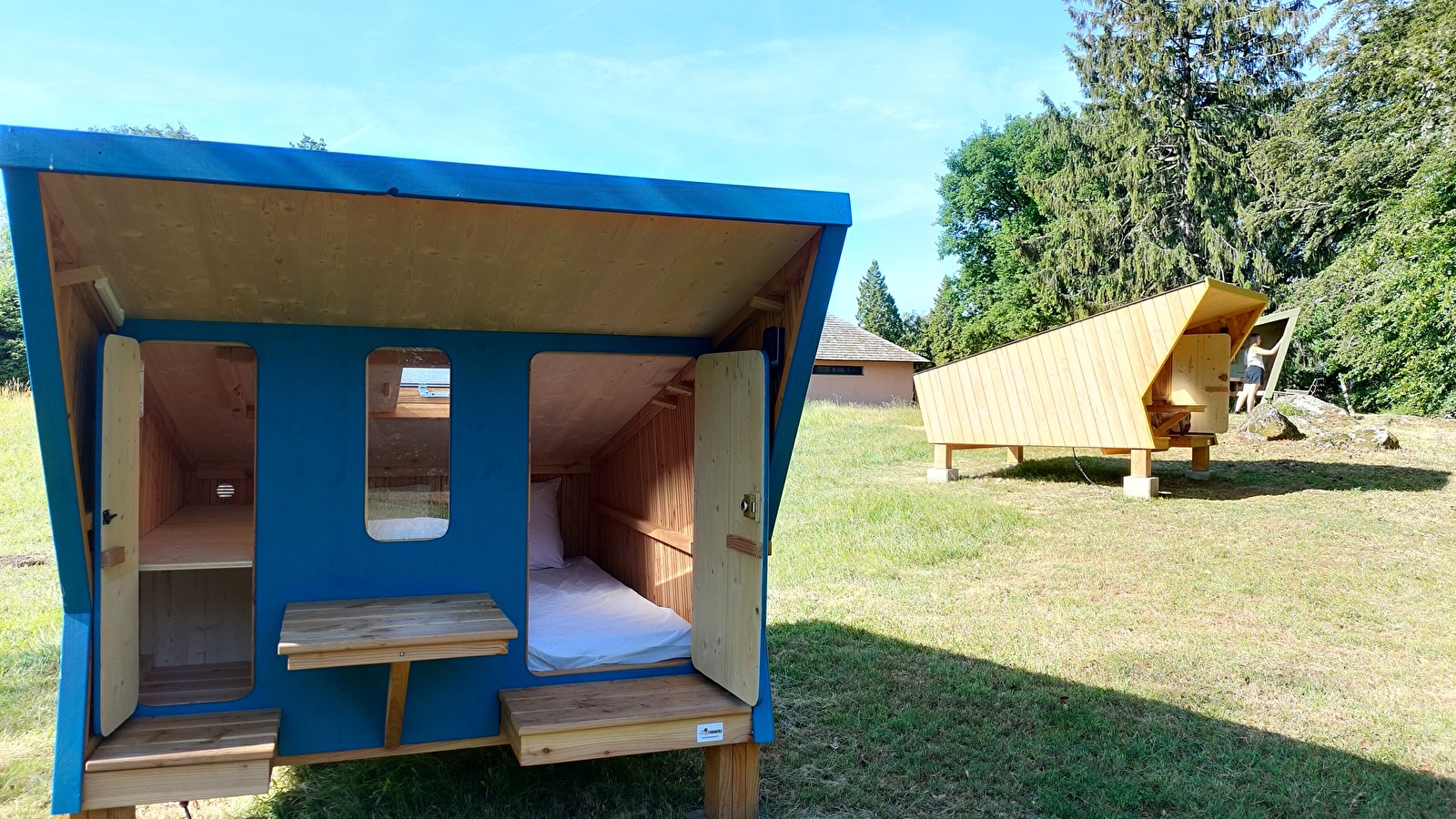Nos Cabanes sont composées d'une partie chambre avec lit de 140 x 190 cm et accès par 2 portes battantes et lucarne et d'une partie jour avec 2 sièges et une table abritée sous auvent, des rangements avec loquets. Des éclairages sont présents dans les deux parties et une prise de courant.