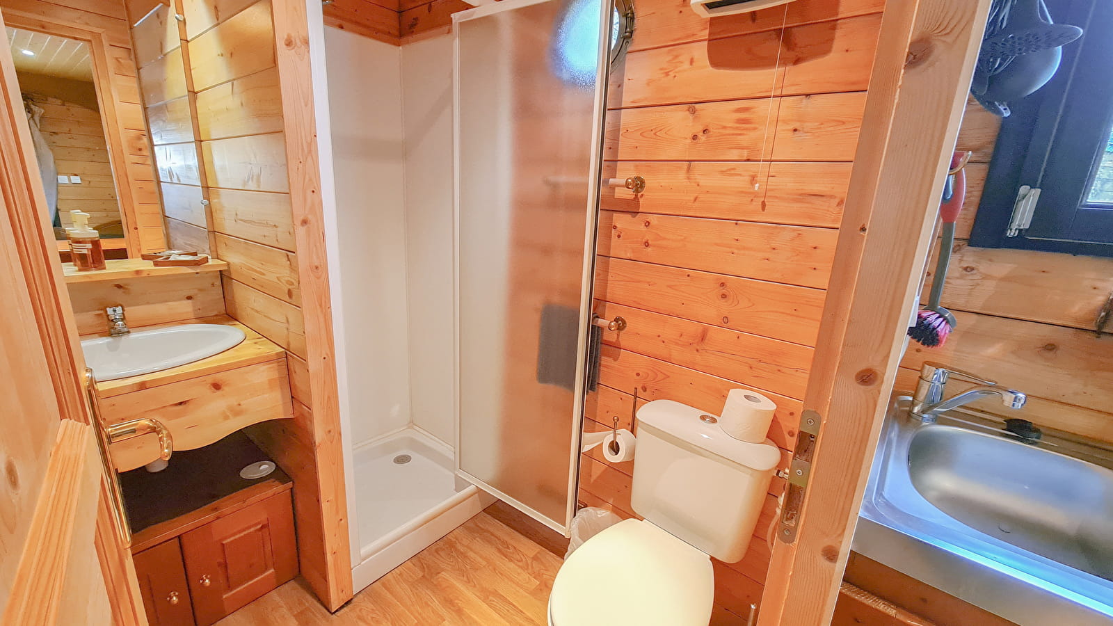 Salle de bain : douche, meuble-évier avec grand miroir, WC.